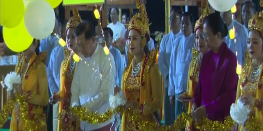 The ceremony commenced with the recitation of Namotasa three times, followed by the recital of victorious and auspicious rituals by Union Minister for Religious Affairs and Culture, U Tin Oo Lwin. The Prime Minister and wife formally inaugurated the ceremony by cutting the ceremonial ribbon, followed by striking the auspicious gong that signaled the beginning of the weaving process.