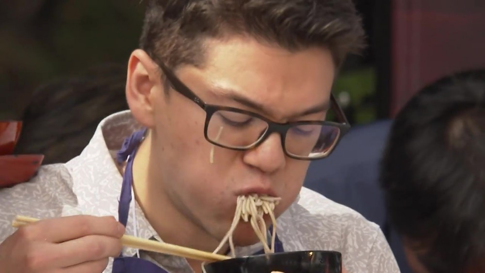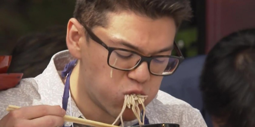 "Wanko soba," served in portions in small bowls, is a specialty of the region. About 80 people from seven countries and a region took part in the first international contest of its kind. Each contestant was given two minutes to eat as many bowls of buckwheat soba as possible. A Japanese team won the adult category.