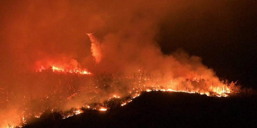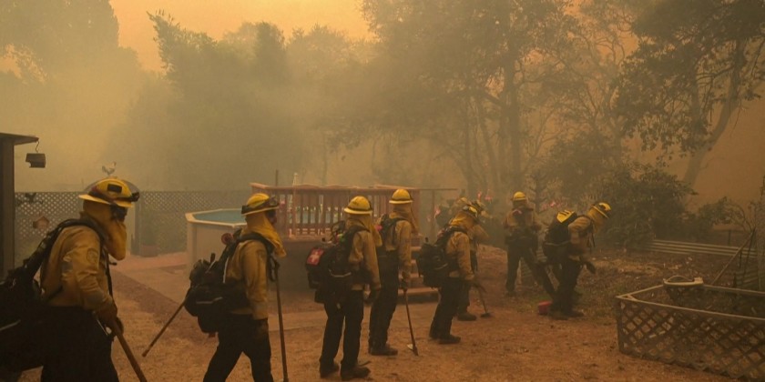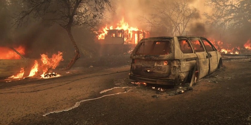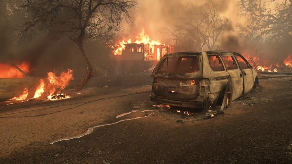 Thousands of people have been ordered to evacuate as a wildfire rages out of control in northern California. Flames engulf homes and vehicles as wildfires rage, sending temperatures soaring and forcing evacuations. Firefighters and helicopters are working to put out the fire.