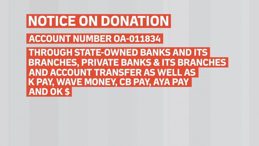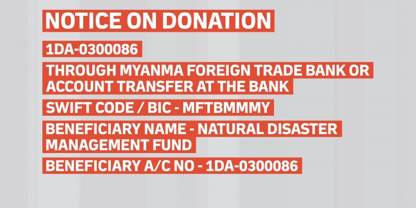 Well-wishers can also donate US dollars, euro and Singapore dollars to the account number 1DA-0300086 through the Myanmar Foreign Trade Bank or Account Transfer at the Bank.