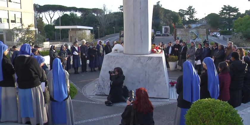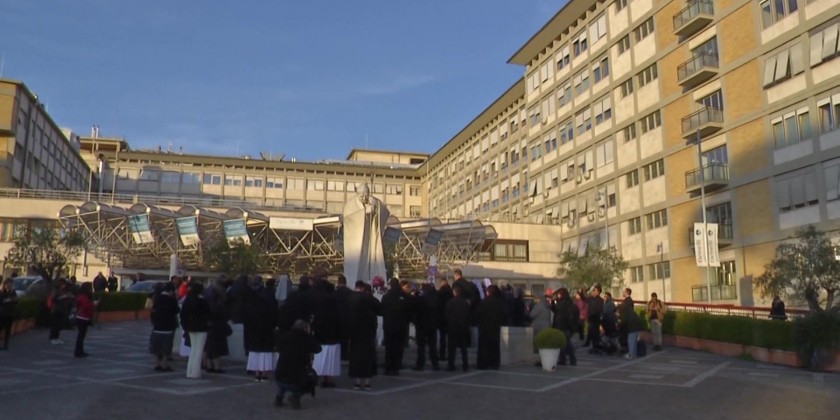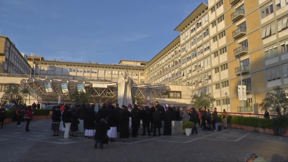 Nuns gathered outside Rome’s Gemelli hospital on Sunday to pray for the health of Pope Francis, who has now been in the hospital for a week. The Pope’s condition has slightly improved over the past couple of days, according to the Vatican, but he continues to be treated for pneumonia in both lungs after initially being admitted with breathing difficulties.