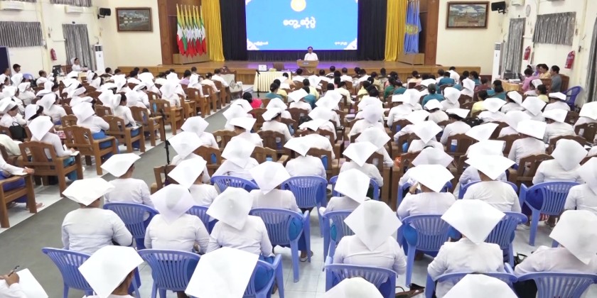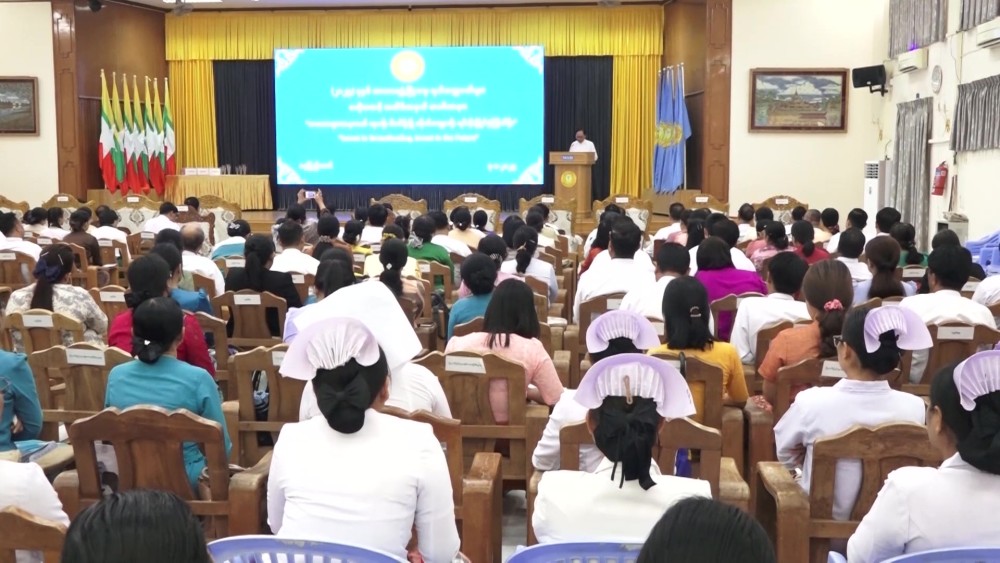 In the afternoon, the Union Minister attended a meeting with nurses from the Department of Public Health, Department of Medical Services, and Department of Health Human Resources, where he gave guidance. Deputy Minister of Health, Professor Dr. Aye Tun, also gave a speech with guidance. Attendees then raised and discussed the difficulties they face in their work.