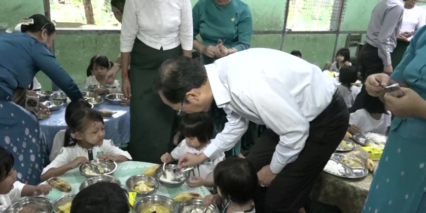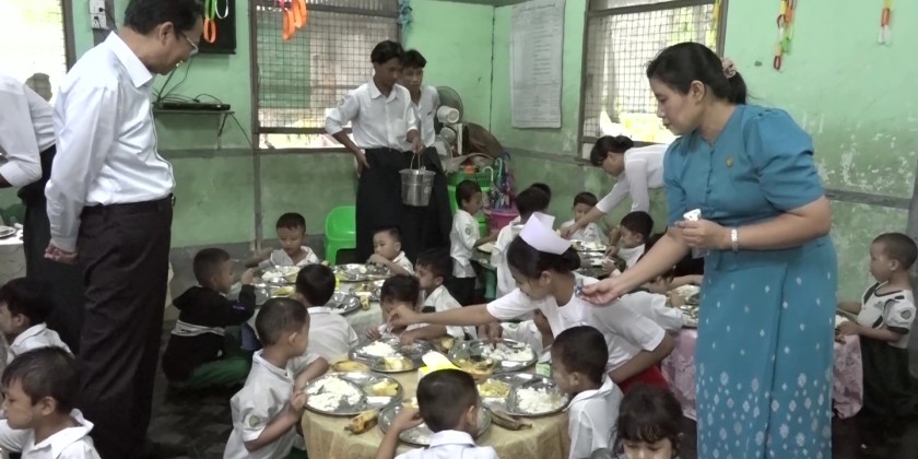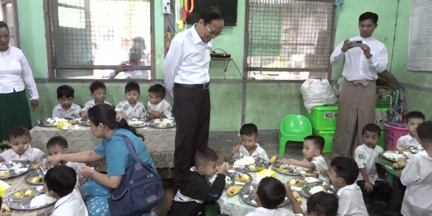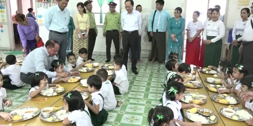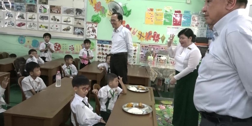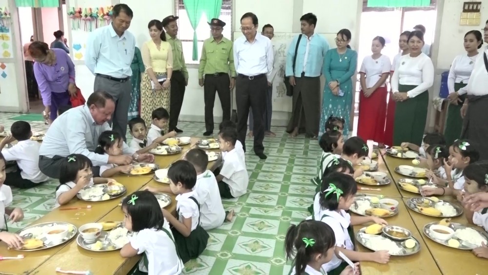 Union Minister for Health Professor Dr. Thet Khaing Win, together with officials, visited Hlaing, Dagon, and Mayangone townships in Yangon Region to observe school nutrition programs being carried out under the cooperation of the Ministries of Health and Education.