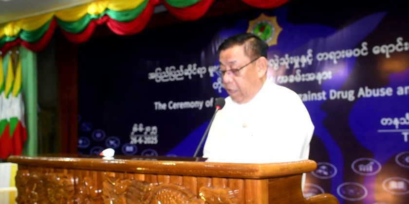 At the event, Tanintharyi Region Chief Minister U Myat Ko, stated that June 26 was designated by the United Nations General Assembly in 1987 as the International Day Against Drug Abuse and Illicit Trafficking. This year marks the 38th observance of this day, which is commemorated annually in countries around the world, including Myanmar. He added that various forms of drug trafficking occurring in the region are being tackled by the Tatmadaw, Myanmar Police Force, and the Anti-Narcotics Police, who have devised strategic plans based on their respective jurisdictions. He emphasized that public awareness programs conducted daily to reduce and eliminate drug abuse are proving to be an effective method. In line with this, the Department of Education, the Information and Public Relations Department, and the regional police force are collaborating to intensify anti-drug awareness campaigns among the general public and youth/students.