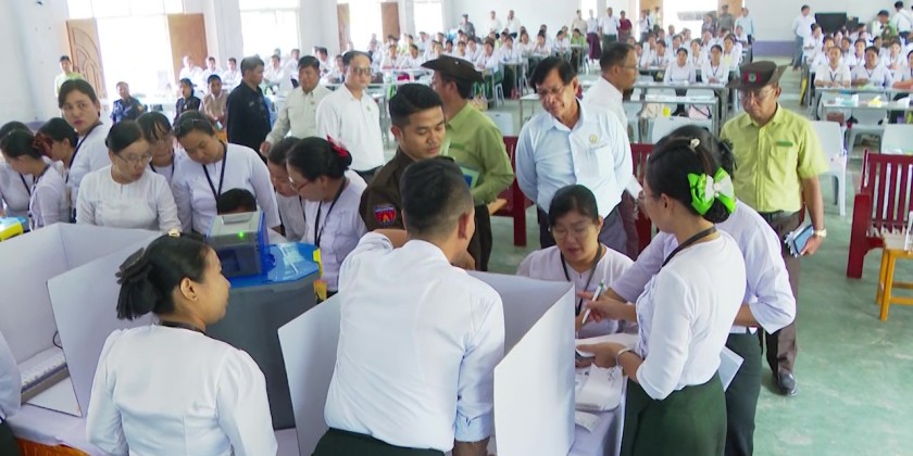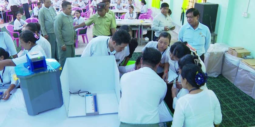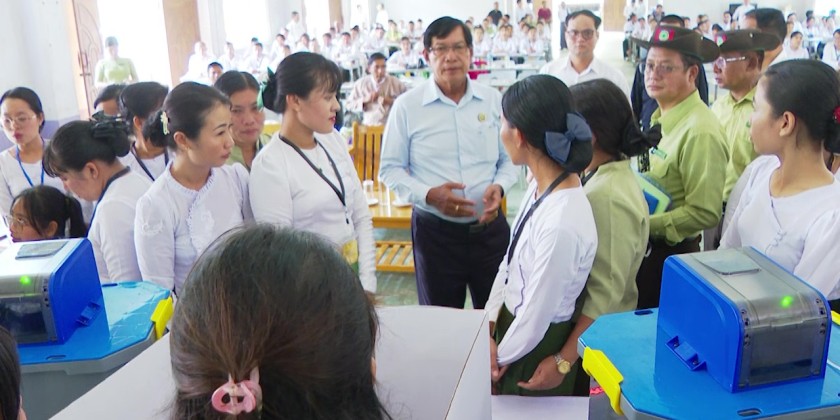 Yangon Region Chief Minister U Soe Thein and members of the Region Government visited Twantay and Dala Townships in Yangon Region to observe and encourage the ongoing training sessions on the use of the Myanmar Electronic Voting Machine (MEVM), on July 15.