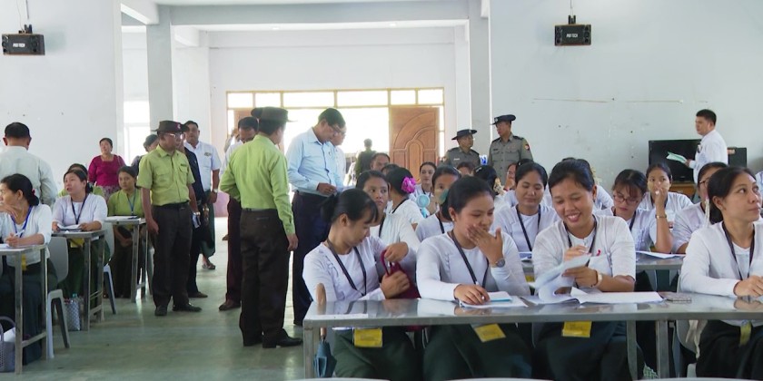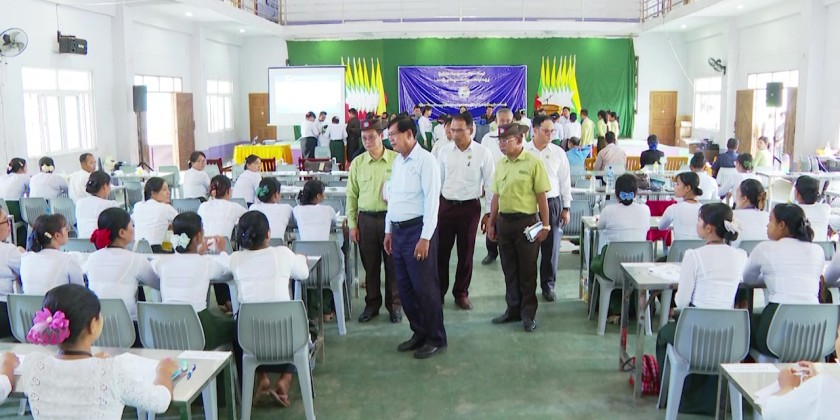 First, the Chief Minister and officials observed the training session being held at the Pyinnya Yadana Hall of Basic Education High School No. (2) in Twantay Township, where 105 trainees were participating. They also visited the training being conducted at the Thiri Zeya Nawarat Hall of the General Administration Department in Dala Township, where 140 trainees were attending. During the visits, they warmly interacted and exchanged greetings with the trainees.
