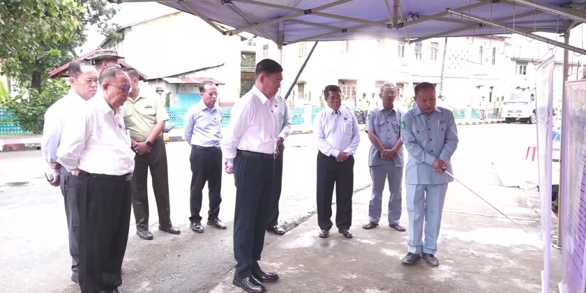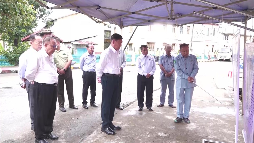 First, Rakhine State Chief Minister U Htein Lin and officials inspected Block No. (4), Kyay Pin Gyi Ward, Kyaung Gyi Road in Sittwe, where they observed and inspected the collective cleaning efforts by the special cleaning team. The Director of the Development Committee, U Kyaw Moe, explained the plans to carry out the special cleanliness and beautification drive for Sittwe by dividing it into five blocks and implementing road-wise plans, as well as the efforts to provide employment opportunities for people from temporary displacement camps. The State Minister for Natural Resources supplemented the presentation.