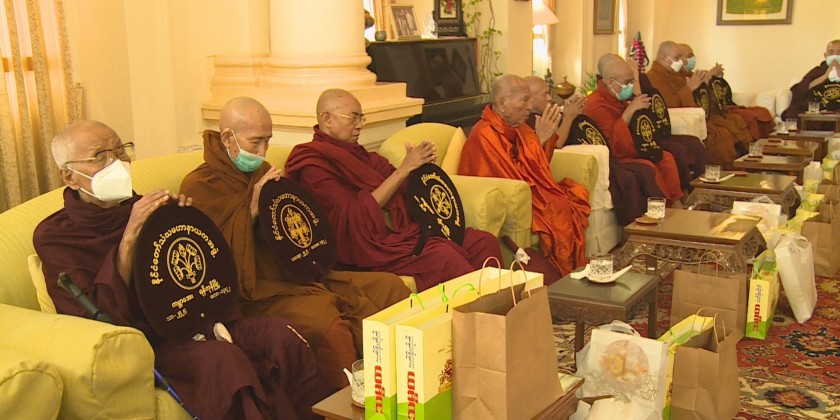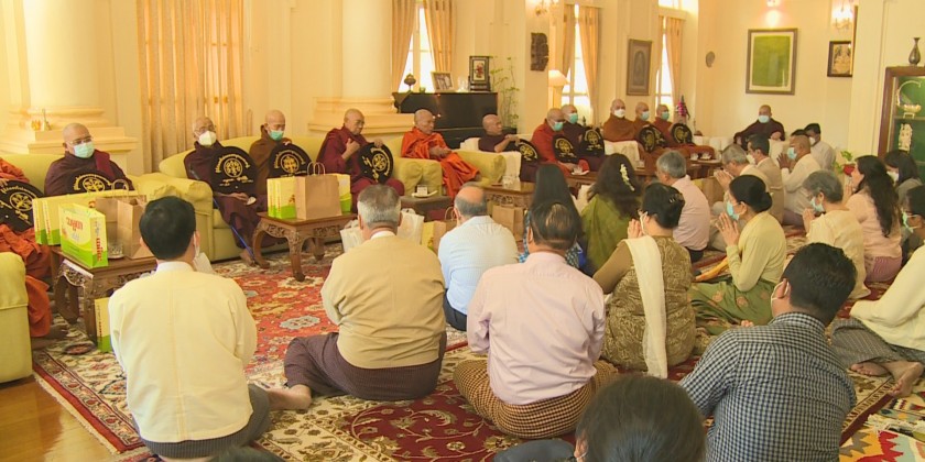 The ambassador, his family and well wishers presented offertories to the members of the Sangha. Meiktila sayardaw Baddant Kawvila, vice- chairman of the State Sangha Maha Nayaka Committee delivered the sermon on the benefits of offering Soon and offertories. The ambassador expressed his personal feeling of honor, gratifying, fulfilling and satisfaction by offering ‘Soon’ to the Sangha.