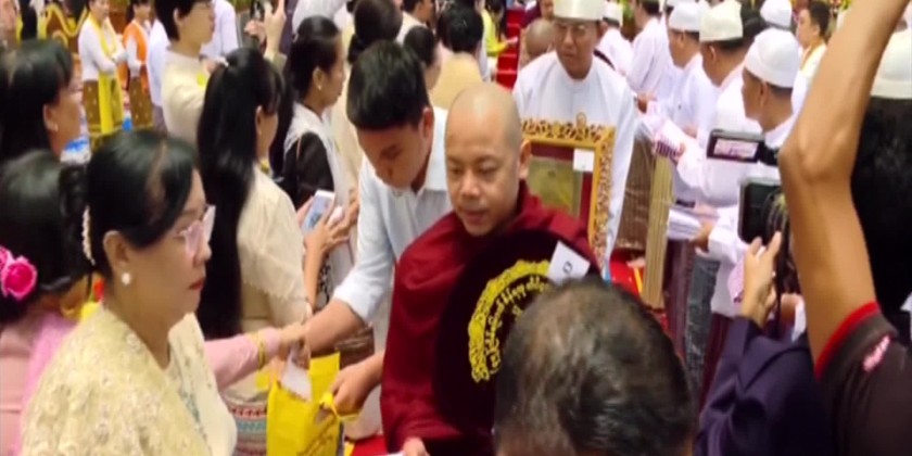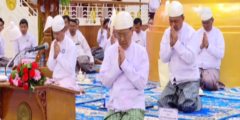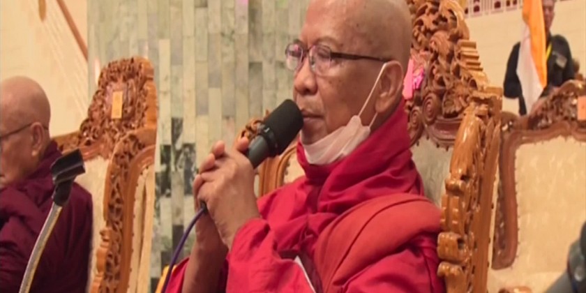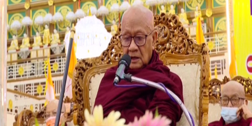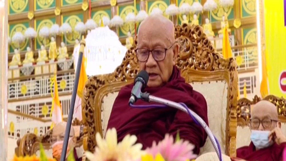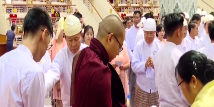 The Vice-Senior General and party took the Five Precepts from Vice-Chairman of the Ovadacariya Committee of the examination Presiding Nayaka of Mogaung Monastery of Hinthada in Ayeyawady Region AbhidhajaMaha Rattha Guru Abhidhaja AggaMaha Saddhammajotika Bhaddanta Sudhammacarabhivamsa.