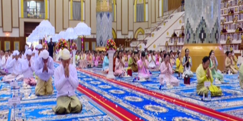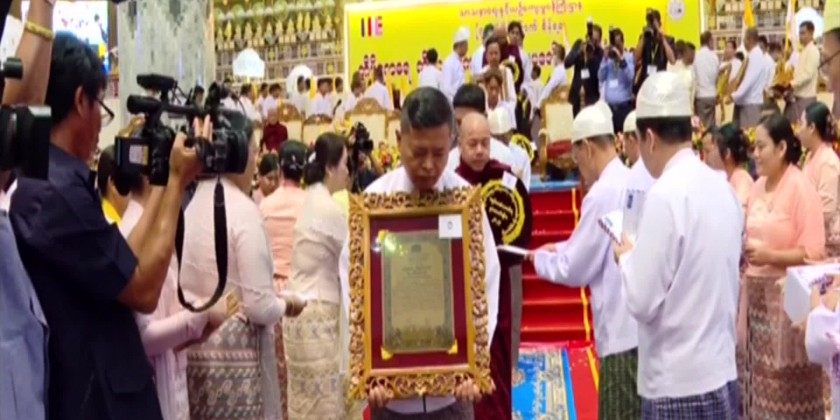 Union Ministers U KoKo, U MyintKyaing and Dr. ThetKhaing Win, Chief Minister of Yangon Region U SoeThein, Lt-Gen ThetPon of the Office of the Commander-in-Chief (Army), Commander of Yangon Command Maj- Gen Zaw Hein offered the respective title and certificate to 85 members of Sangha who passed the respective Tipitaka examinations. Vice Chairman of the SanghaMahaNayaka Committee Chief of Mahanayaka Sayadaw of Ma Soe Yein Taikthit monastery AggaMaha Pandita Aggamaha Saddhamma jotikadhaja BhaddantaKesarabhhivamsa delivered a sermon, and congregation led by the Vice-Senior General shared merits gained.