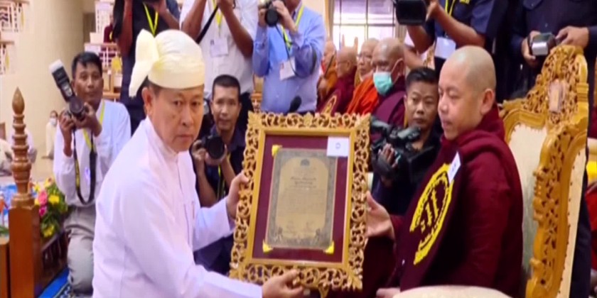 Vice Chairman of the State Administration Council Deputy Prime Miniser Vice-Senior General Soe Win offered MulaAbhidhammakovida title and certificate to AshinJotikalankara and AshinVasavalankara of MingunTipitakanikaya monastery, Moe Meik Hill, Sagaing Township of Sagaing Region, who has passed the two and a half Pitaka treatises,.