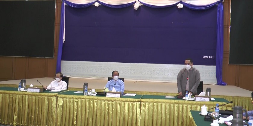 Union Minister for Agriculture, Livestock and Irrigation U Tin Htut Oo on Saturday attended a meeting with oil, bean, oil mill plant and sesame entrepreneurs at the UMFCCI in Yangon.