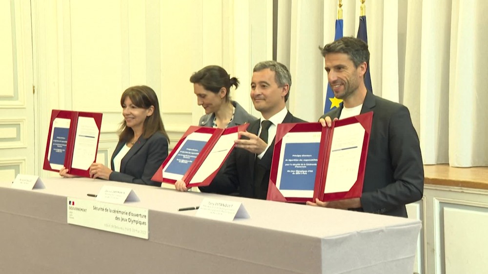 France's Interior and Sports ministers, along with the Paris Mayor and President of the Olympics organising committee attend a press conference where they present several measures that should allow "hundreds of thousands of people" to watch the Olympic opening ceremony free of charge from the high docks after signing the protocol for the opening ceremony of the Paris Olympics next year.