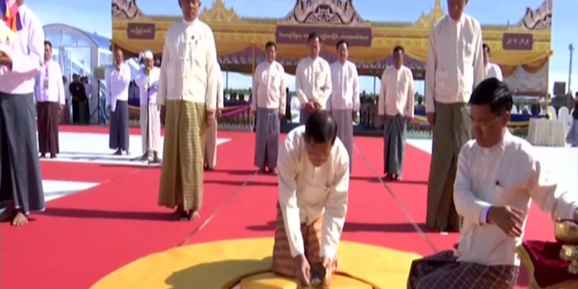After laying and scattering the jewelries on the auspicious ground by the Leading Donor SAC Chairman Prime Minister, the master of ceremony read the Pathavijaya Mantan and auspicious time record. At the auspicious time, the Prime Minister enshrined the pieces of grounds taken from 7 significant sites of Buddhagaya in India and 35 sites of prominent pagodas across the country in the Vijayabuminimmana auspicious ground.