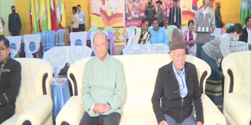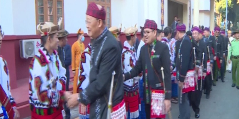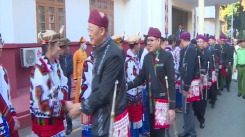 Then, the members of the State Administration Council, Union Ministers, state Chief Minister, Commander of Northern Command, senior military officers, state chief justice, state ministers, state advocate general, state level departmental officials, 6 groups of Kachin nationalities, 5 groups of Shan nationalities in Kachin State, Bamar national race cultural groups, trainees from educational college, nursing training school, border area national races development training school happily participated in manaw dance following the Nau Shawng in line with the tradition.