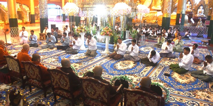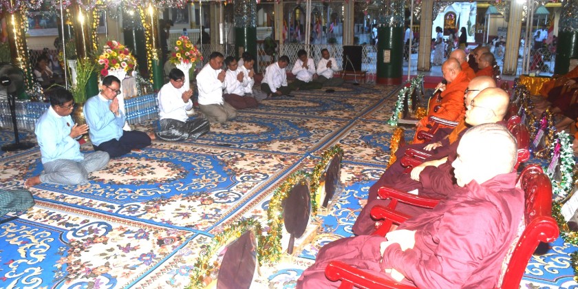After opening the occasion, the congregation led by the Yangon Region Chief Minister U Soe Thein, Commander of Yangon Command Ma-J Gen. Zaw Hein, Deputy Commander, region government ministers, members of pagoda board of trustee observed five precepts administered by the Chairman Sayadaw of Yangon Region Sangha Nayaka Committee and offered the offertories to the members of Sangha.