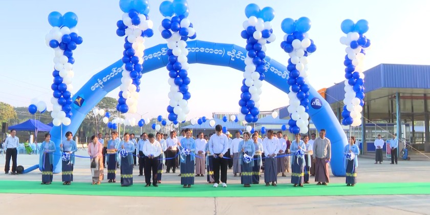Initially, Deputy Minister U Thant Sin and Region Minister U Zaw Win pressed the button to open the new signboard of the LPG sale station (Thaketa) and took a commemorative photo.