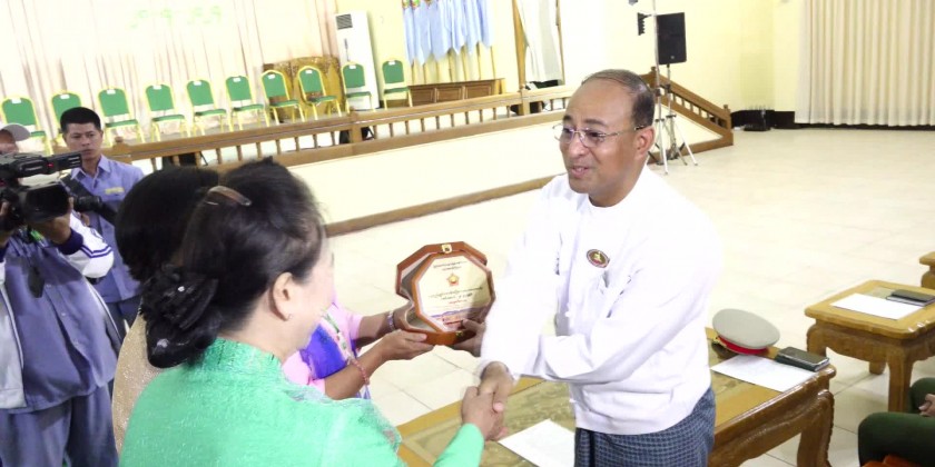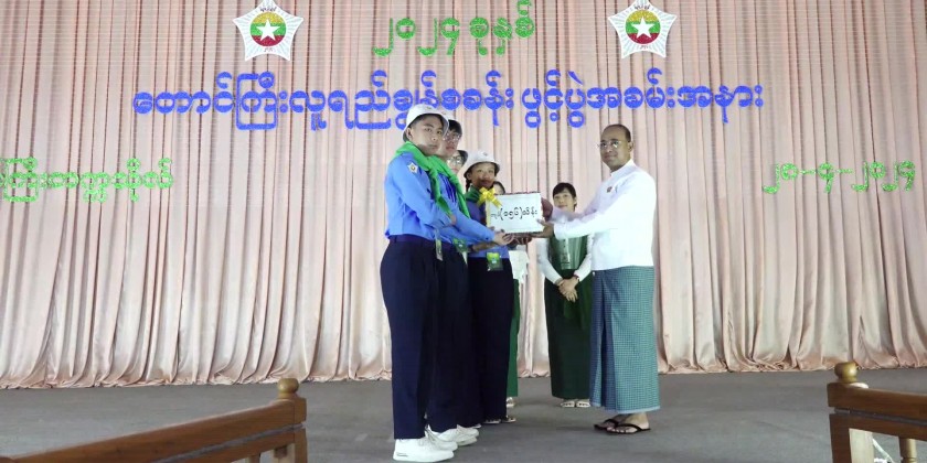 Next, the Chief Minister provided cash assistance for the students and supervising teachers and a pin badge was affixed to one of student and Lu Yay Chuns accepted the pin badges. Later, wife of Chief Minister affixed a pin badge to one of female students and the State Minister for Social Affairs handed the pin badges and the two students accepted on behalf of all outstanding students.
