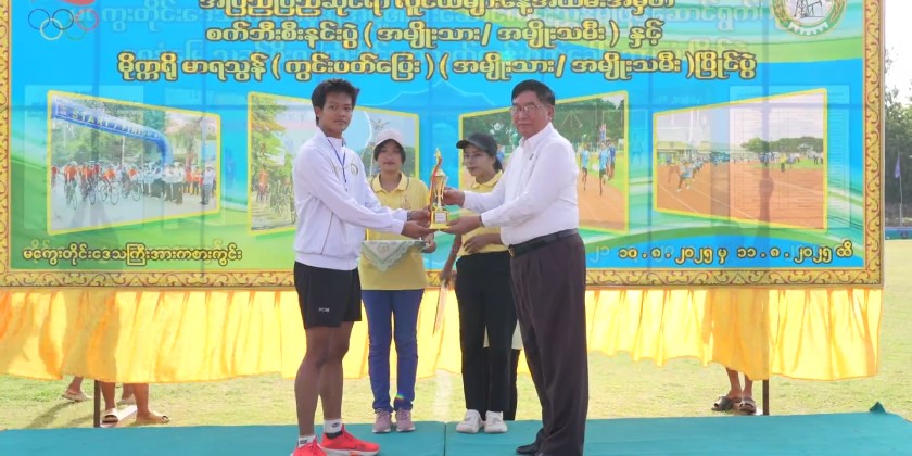 After starting the race, Chief Minister U Tint Lwin and other officials watched the athletes compete. The Chief Minister and officials then presented awards to the winners of the micro marathon competition.