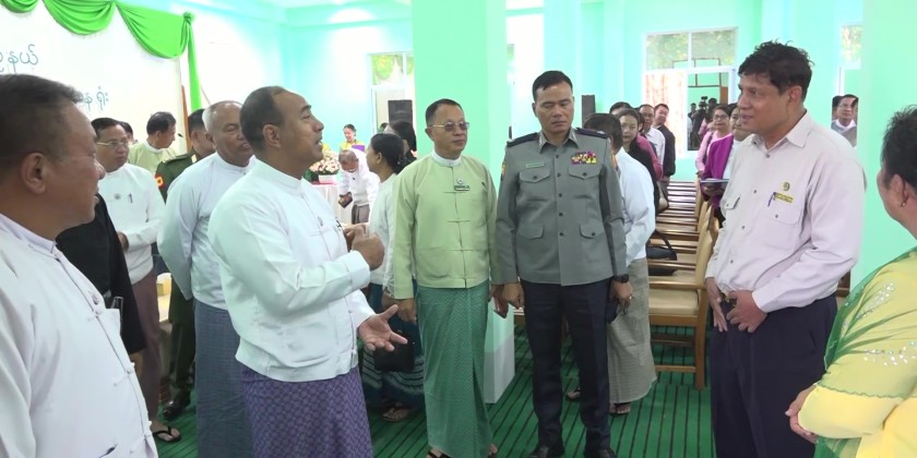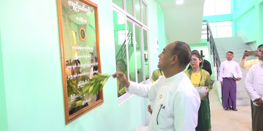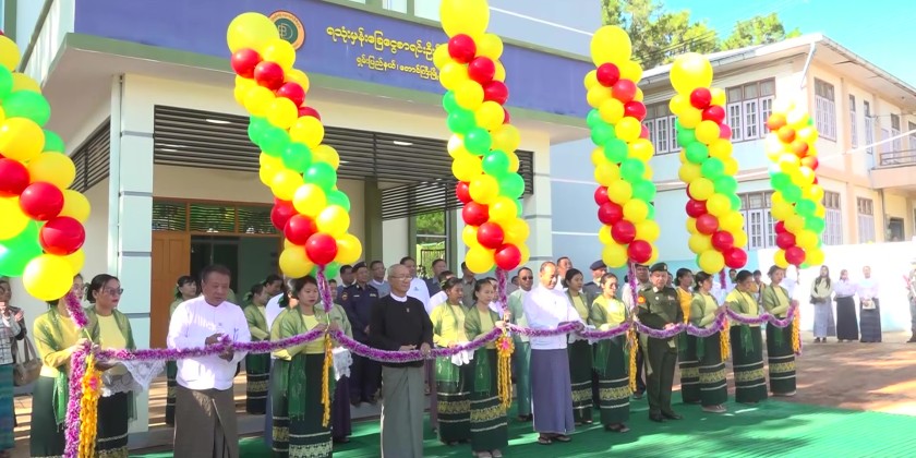 First, the new RC (3-storey) building was officially opened with a ribbon-cutting ceremony performed by Shan State Chief Minister U Aung Aung, the State High Court Chief Justice, the State Minister for Security and Border Affairs, the State Minister for Economic Affairs, and the State Director of the Budget Department.