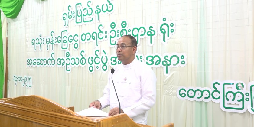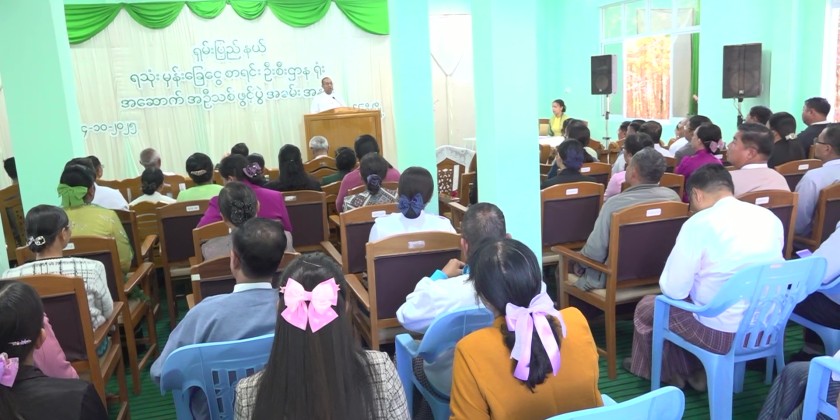 Afterwards, the second part of the ceremony was held in the office's training hall. Shan State Chief Minister U Aung Aung delivered a speech, and the Director of the Shan State Budget Department expressed words of thanks. Documents related to the new building were then handed over by a responsible official from the Special Building Unit (11) and received by the Director of the State Budget Department.