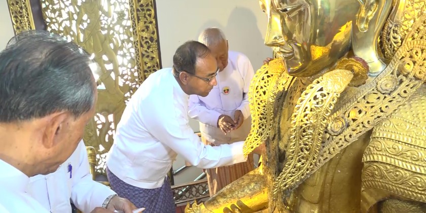 Following this, the Chief Minister and responsible officials proceeded to the Atula Marazein Hsu-Taung-Pyae Buddha in City Center Dhamma Hall in Taunggyi. There, they reverently paid homage and offered flowers, water, alms food, and golden robes. It is also learned that they offered the midday meal to the novice monk examinees from various Regions and States who will be taking the 24th Kambawza Sāmaṇe-Kyaw Examination.