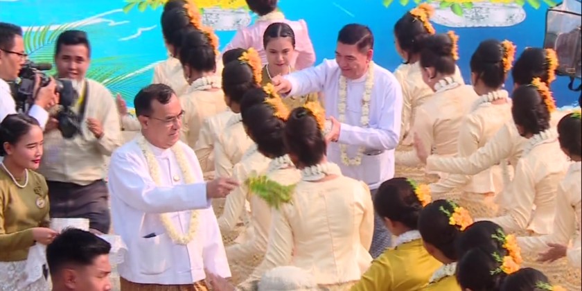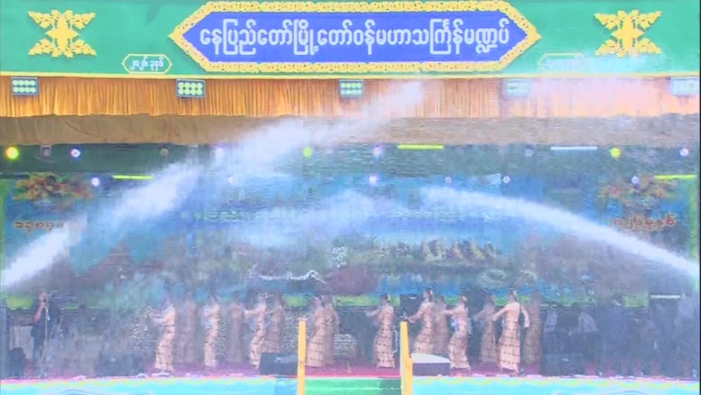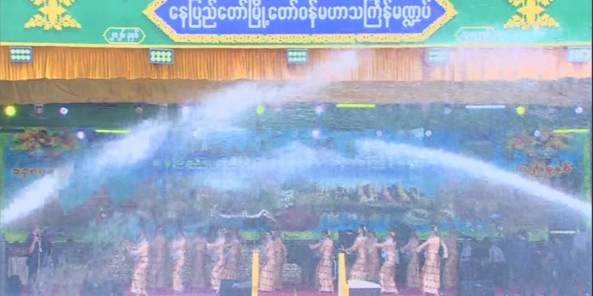 Subsequently, Thingyan Yein dance troupes performed a collective song and dance to the song "Myu Hmaung Wai Kin." The Union Ministers and the Chairman of the Nay Pyi Taw City Development Committee and Mayor then used Eugenia branches to sprinkle New Year Thingyan water on the Yein dance troupes, artists, and vocalists.