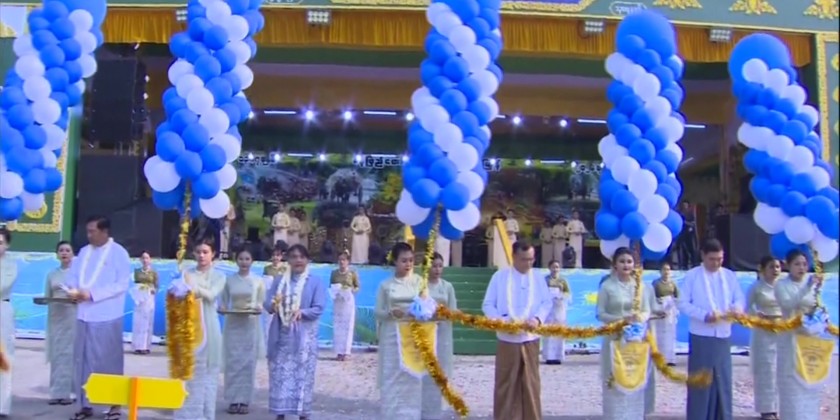 After that, the Union Minister for Ethnic Affairs U Than Maung, the Union Minister for Legal Affairs and Union Attorney General Dr. Thida Oo, the Union Minister for Information U Htein Lin, the Union Minister for Hotels, Tourism, and Culture U Maung Myint, and the Chairman of the Nay Pyi Taw City Development Committee and Mayor U Kan Myint Than cut the ribbon to officially open the Nay Pyi Taw City Mayor Maha Thingyan Pavilion.