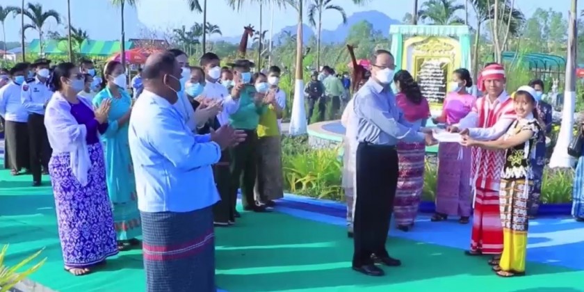 Afterward, chief minister and wife Daw Nan Baby Myint, members of state government viewed round the over four hundred thousand trees and plants, concrete walking path, circular water fountain, lake and waterfall, arch bridge, rest house, children play ground, beautifying flowers and landscape, four Kayin traditional houses, coffee shop and water supply system and the chief minister provided cash to the Kayin traditional Done dance group, drum and fife band and pom-pom dance group.