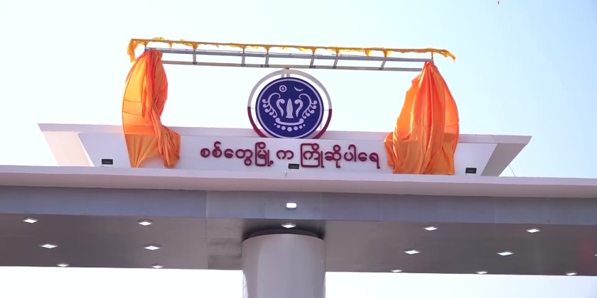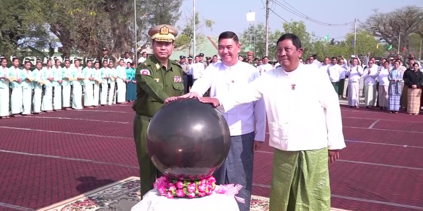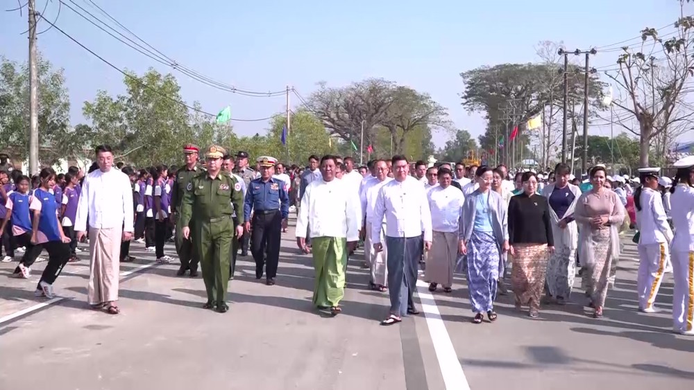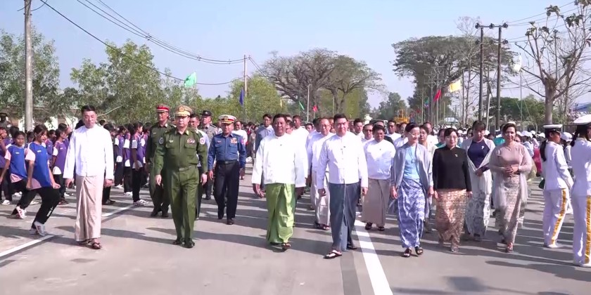 A ceremony to inaugurate the Sittwe City Gateway, held in commemoration of the 81st Armed Forces Day, took place in front of the gateway on the morning of March 25th. The event was attended by Rakhine State Chief Minister U Htein Lin and his wife, State Hluttaw Speaker Dr. San Shwe, Commander of West Command Ma-J Gen. Kyaw Zaw Oo, Chief Justice of the State High Court, Deputy Speaker of the State Hluttaw, members of the State Government and their spouses, senior military officers from Sittwe Station, State Hluttaw representatives, departmental officials, town elders, local residents, teachers, students, and invited guests.