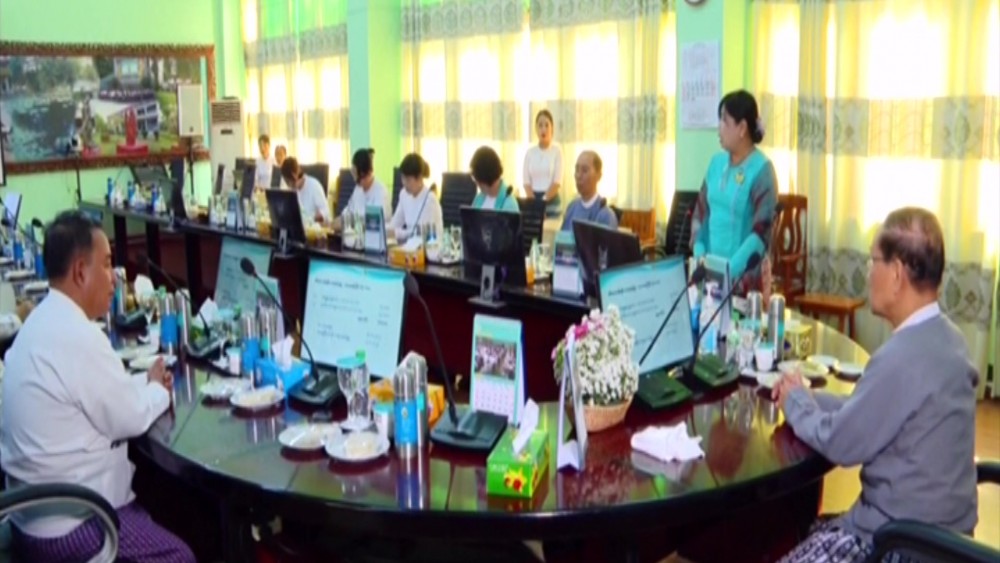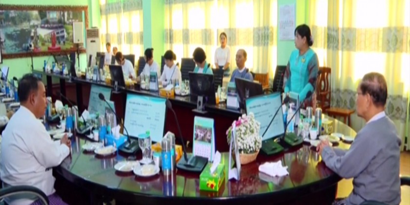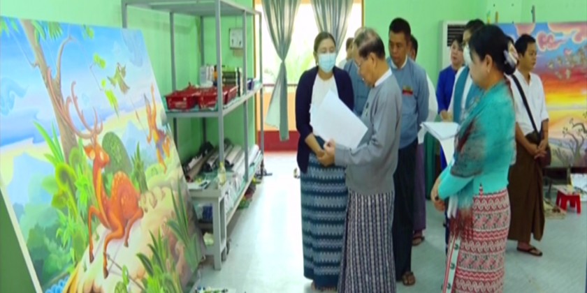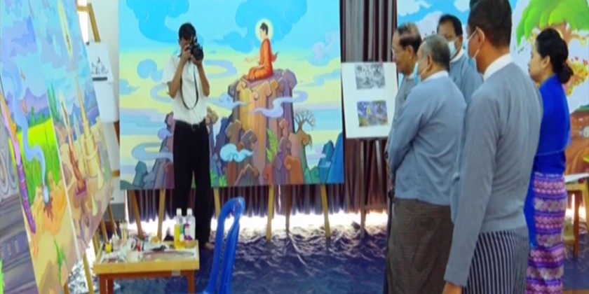 Union Minister for Religious Affairs and Culture U KoKo together with officials looked into drawing of paintings at the National University of Arts and Culture (Yangon) in Dagon Myothit (South), the State High School of Fine Arts (Yangon) and the Myanmar Arts Center by the Myanmar Paintings and Sculpture Association, that will be kept at the repositories in the compound of Maravijaya Buddha Image that is being built in Nay Pyi Taw on Monday.