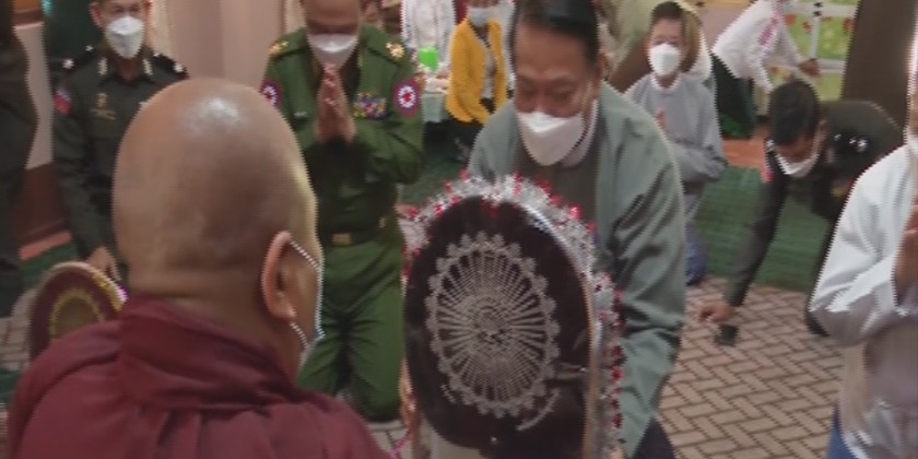 Afterward, the union minister and party paid homage to the presiding Sayadaw of Maha Bodhi monastery reported the issuing National Scrutiny Cards to the local people with Pan Khin Project and offered offertories to the Sayadaw.