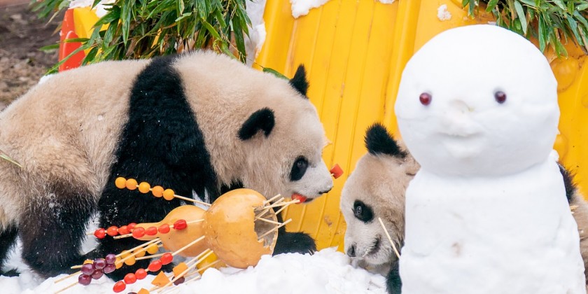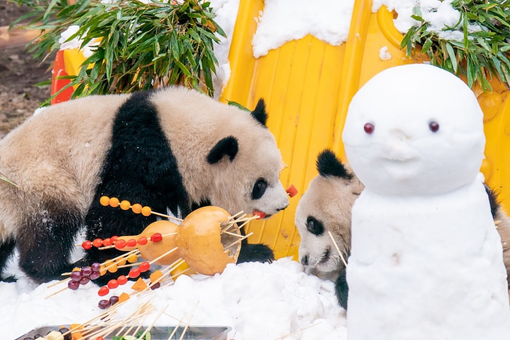 The giant panda twin celebrities Yu Ke and Yu Ai spent the new year day of 2024 eat fruits and vegetables in the snow at Chongqing Zoo. Zookeepers prepared a variety of fruit and vegetable snacks, and even made two snowmen for the panda twins for fun.