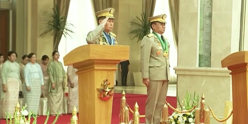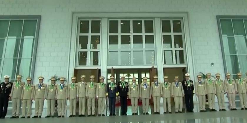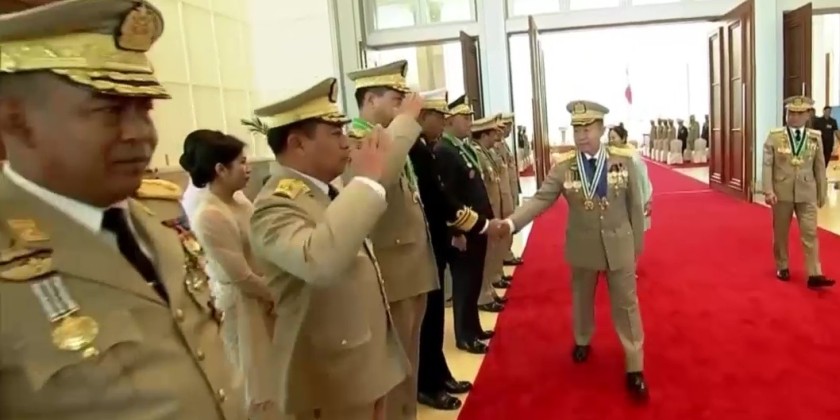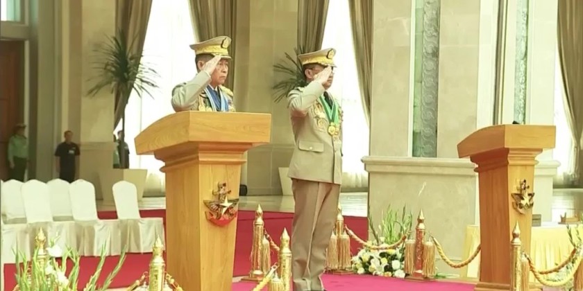 Subsequently, the incumbent Deputy Commander-in-Chief of Defence Services, and the incoming Deputy Commander-in-Chief of Defence Services, who will assume the transferred duties, took their places on the saluting dais and received a salute from the honor guard company.