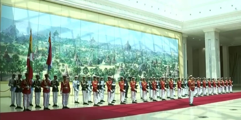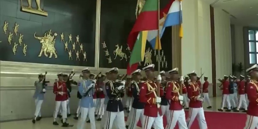 Afterward, as the motorcade carrying the outgoing Deputy Commander-in-Chief of Defence Services, Vice-Senior General Thiri Pyanchi Maha Tharay Sithu Soe Win, and his wife, Daw Than Than Nwe, departed from the Zeyathiri Beikman Hall, a ceremonial guard band played and sang.