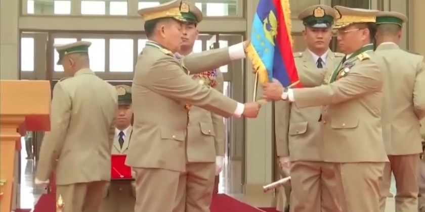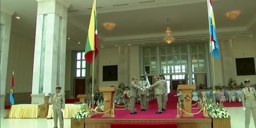 After that, the incumbent Deputy Commander-in-Chief of Defence Services, Vice-Senior General Thiri Pyanchi Maha Tharay Sithu Soe Win, handed over the insignia sword and the flag of the Office of the Deputy Commander-in-Chief of Defence Services to the incoming Deputy Commander-in-Chief of Defence Services, Chief of General Staff (Army, Navy, Air) General Zayya Kyaw Htin Thray Sithu Kyaw Swer Lin, and presented him with the seal of command of the Deputy Commander-in-Chief of Defence Services.
