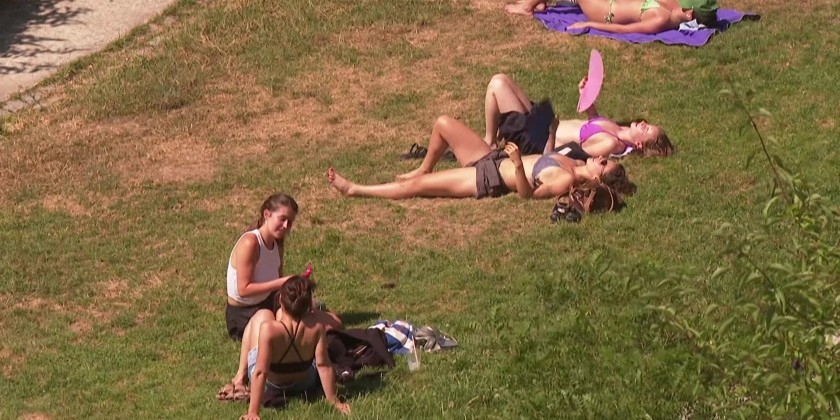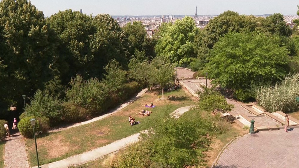 Parisians sunbathe on the lawns of Belleville Park as temperatures soar above 30 degrees in the capital and a heatwave peaks across France, with 16 departments still under an orange 'heatwave' warning, according to France's weather agency, Meteo-France.