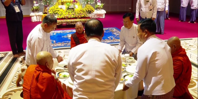 After listening to the sermons delivered by the Presiding Sayadaw of Pali University, Mingalar Zayyone Monastery, the congregation share the merits gained. After the ceremony, the secretary of the State Adminstration Council and officials offered day meal to the members of Sangha.