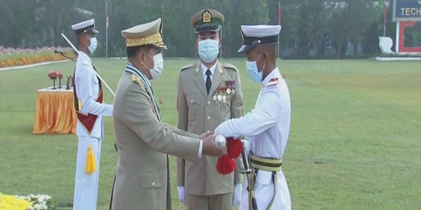 First, the cadet companies saluted the Senior General with slow-march past and quick-march past. The Senior General presented Best Cadet Award to Cadet No. 7888 Cadet Tin Myo Oo, Excellent Award in Training to Cadet No. 7964 Cadet Win Moe Thu, Excellent Award in Studies to Cadet No. 7902 Cadet Nay Htet Win.