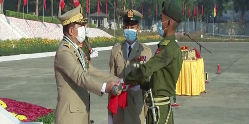 First, the Senior General received a salute and inspected the graduates, after which the passing out companies conducted a quick march and slow march past the Commander-in-Chief of Defence Services. Next, the Tatmadaw Commander-in-Chief presented awards to the graduating cadets.
