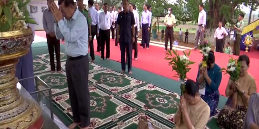 First, the SAC Chairman Prime Minister and entourage viewed the renovation works of over 1,000 years old ancient historic Kyaik Pyinyaya pagoda situated near Bago University in Otthar Myo Thit of Bago Township and offered the flowers, water and oil lamp to the pagoda.