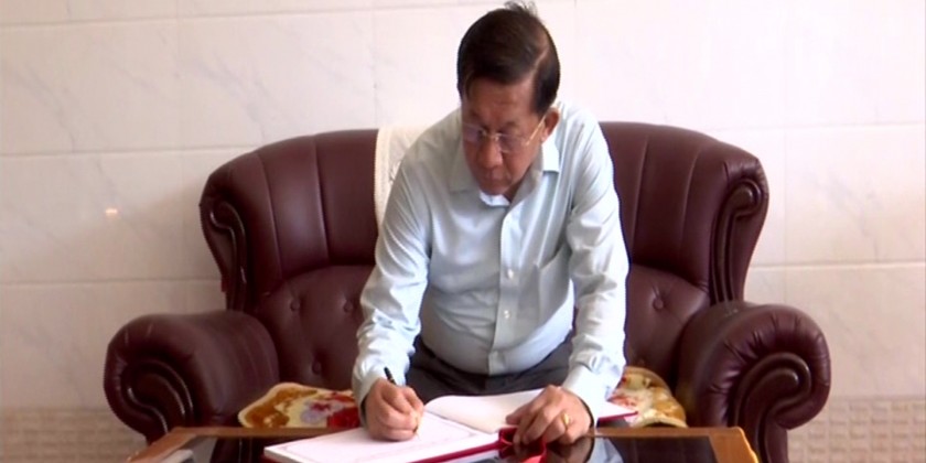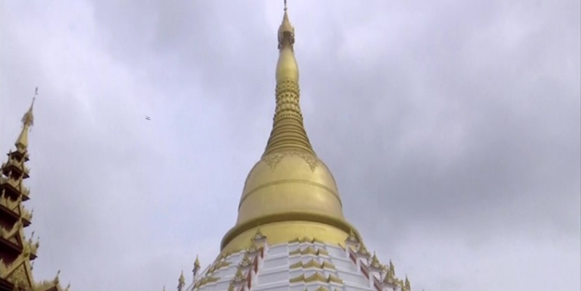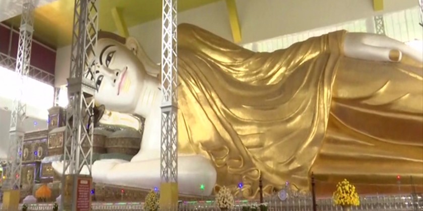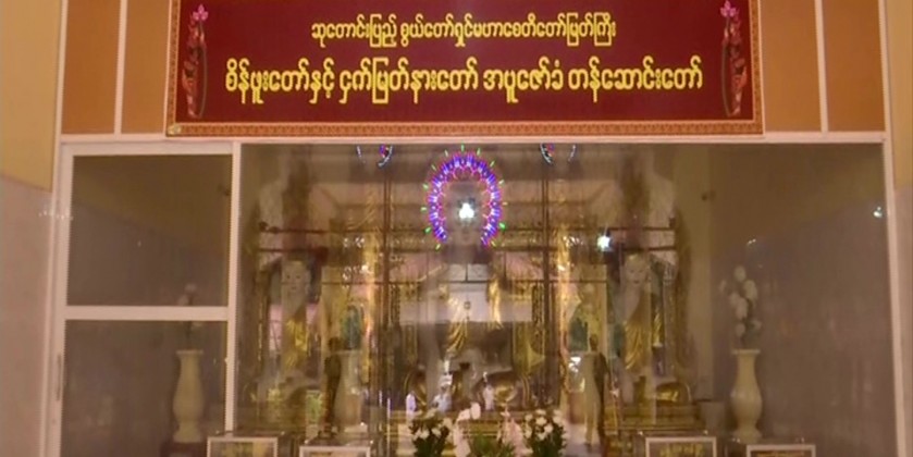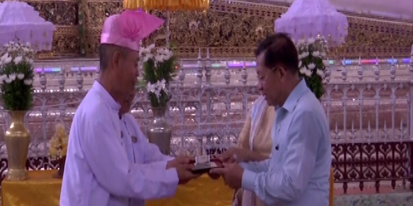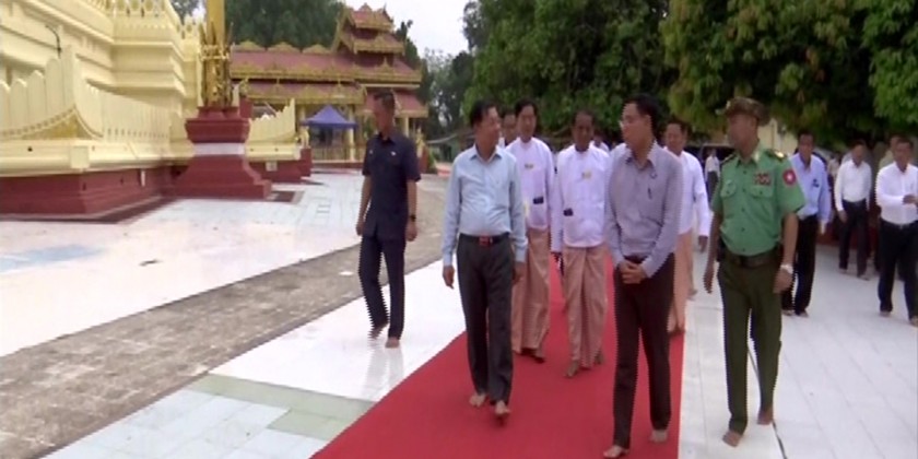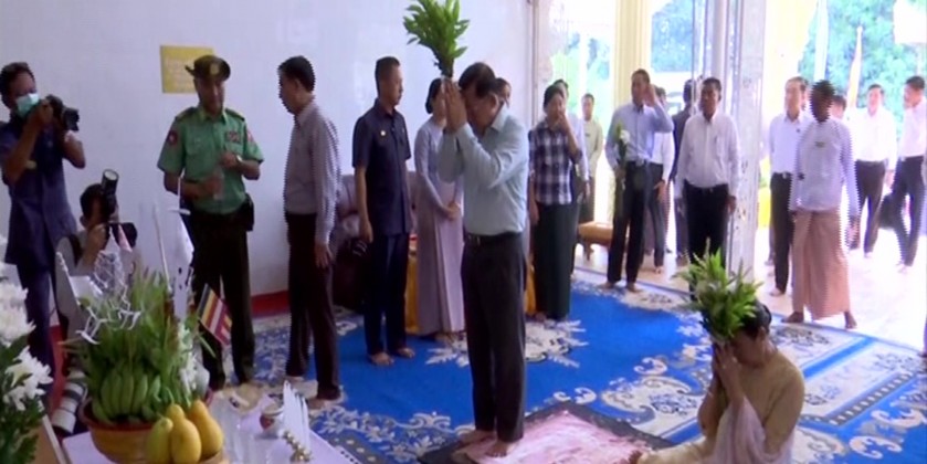 When arriving at the Shwe Maw Daw pagoda, the Prime Minister and party paid homage to the pagoda and offered flowers, water and oil lamp, cash donation and signed on the guest book of the Buddha image.