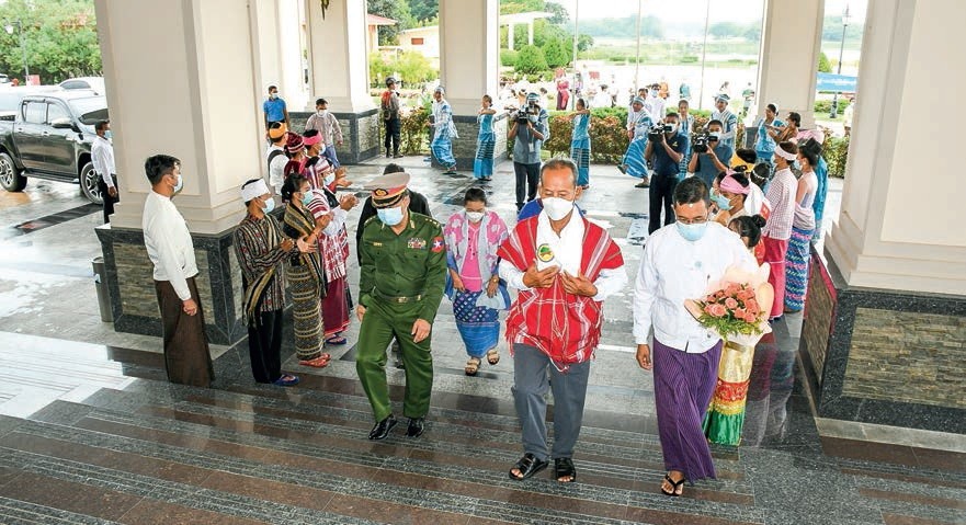 On arrival at Horizon Lake View Resort in Nay Pyi Taw, they were welcomed by members of the National Solidarity and Peace making Negotiation Committee and officials, ethnic nationalities of the Department of Culture and people by holding the miniature state flags and placards bearing “Perpetual Peace is
