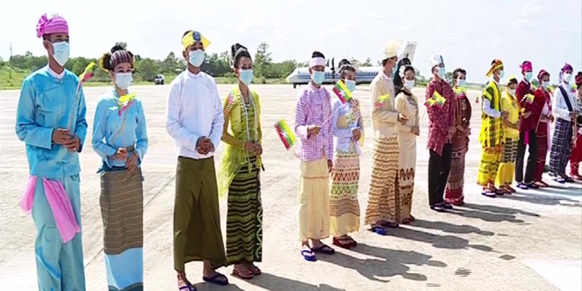 On arrival at the airport in Nay Pyi Taw, the delegation was welcomed by members of the National Solidarity and Peace-making Negotiation Committee and ethnic people from the Department of Culture holding the Myanmar miniature flags and placards bearing, “Perpetual Peace is the real aspiration of the people”, “Achieving peace is the true desire of all citizens”, “Let’s hold talks for peace in the Union”, “Only the ethnic nationalities are in unity, stability, peace and tranquility will be achieved”.