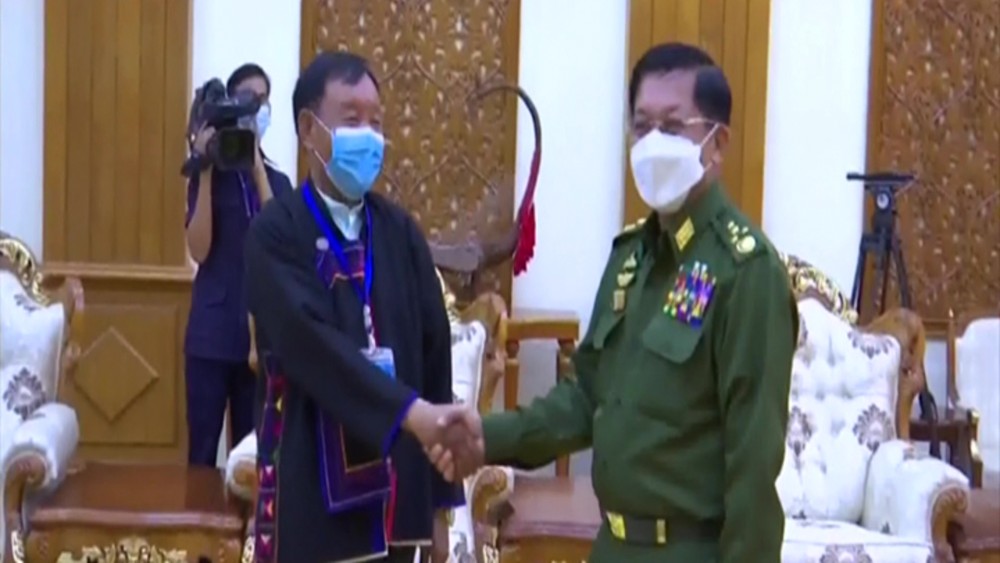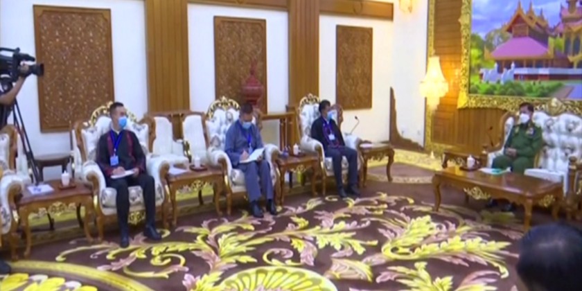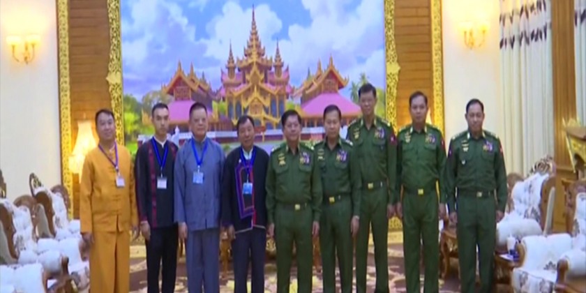 Chairman of the State Administration Council Commander-in-Chief of Defence Services Senior General Min Aung Hlaing received a peace delegation led by Vice-Chairman of the National Democratic Alliance Army-NDAA (Mongla) U San Pae at the parlour of Bayintnaung Villa in Nay Pyi Taw Saturday to talk about peace issues.