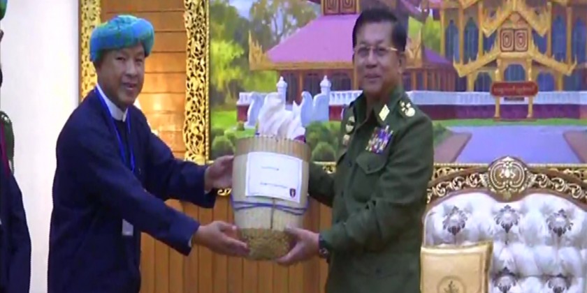 The PNLO Vice-Chair (1) also gave in turn the local gifts to the Senior General. The PNLO peace delegation will continue to hold peace talks with the Peace Talks Team and the National Solidarity and Peacemaking Negotiation Committee formed with SAC members by the State Administration Council.