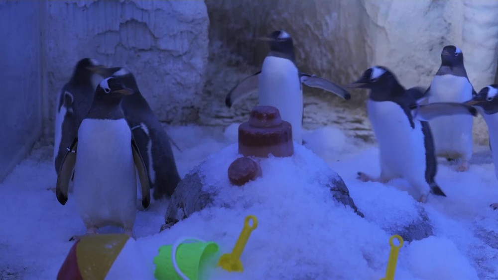 Animals at the SEA LIFE aquarium in London were being fed iced treats to keep cool on Monday as extreme heat scorched parts of the UK.Penguins were surrounded by icy sandcastles, they could peck away at and were fed frozen fish, while the aquarium's resident octopus, Shakira, played with a bright yellow bucket and spade, an activity which is part of the animal's daily enrichment.