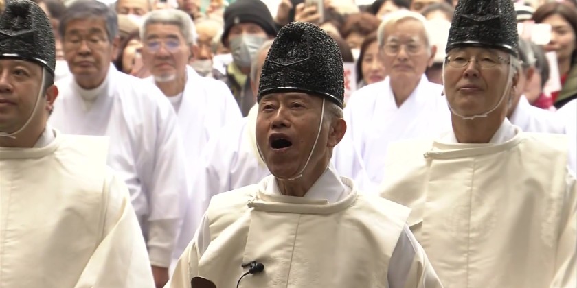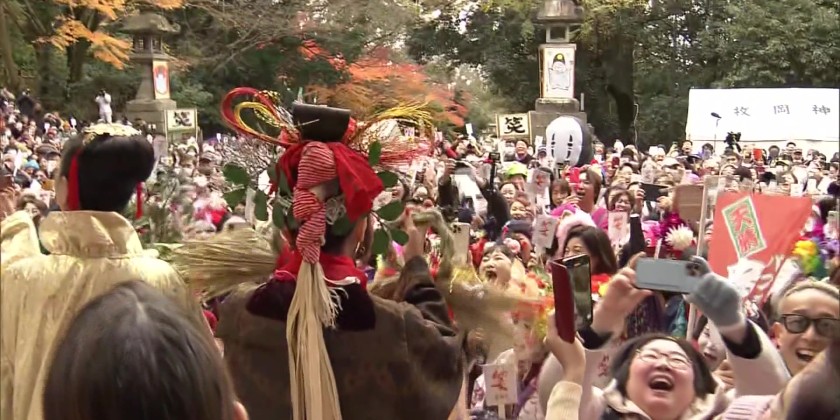 The ritual is based on a Japanese myth that the gods’ loud laughter opened a rock cave in which the sun goddess had locked herself.
