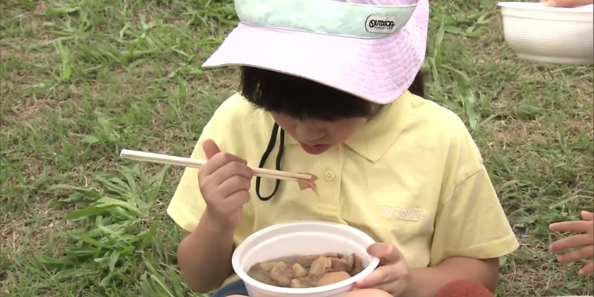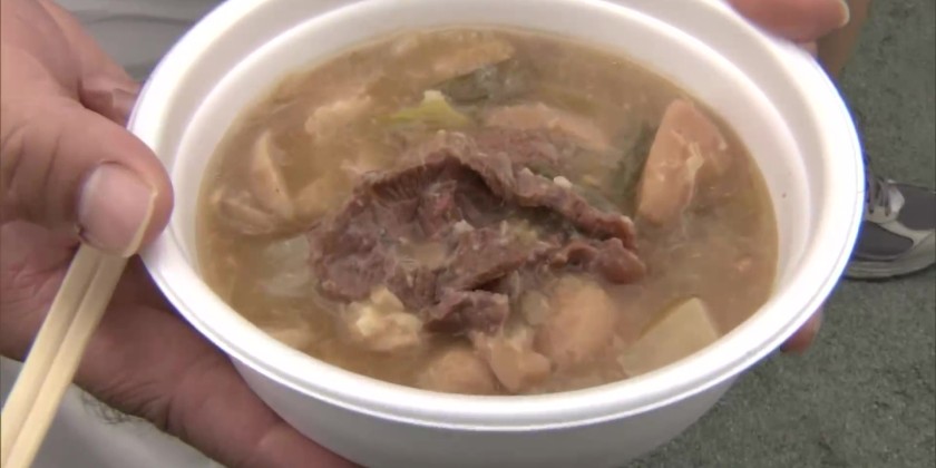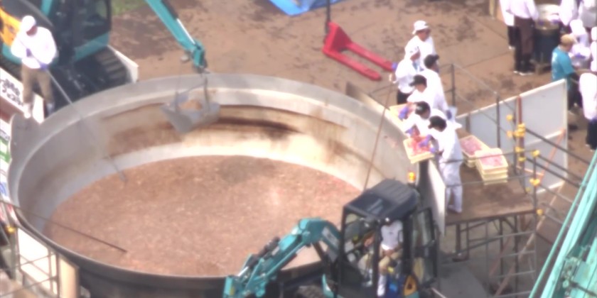More than three tons of taro, around 3,500 green onions and over one ton of beef were put into the pot to prepare about 40,000 servings. Cooks stirred the stew, which was seasoned with soy sauce and sugar. Then two excavators scooped up the stew and put it into smaller containers before it was served to visitors who were waiting in line.