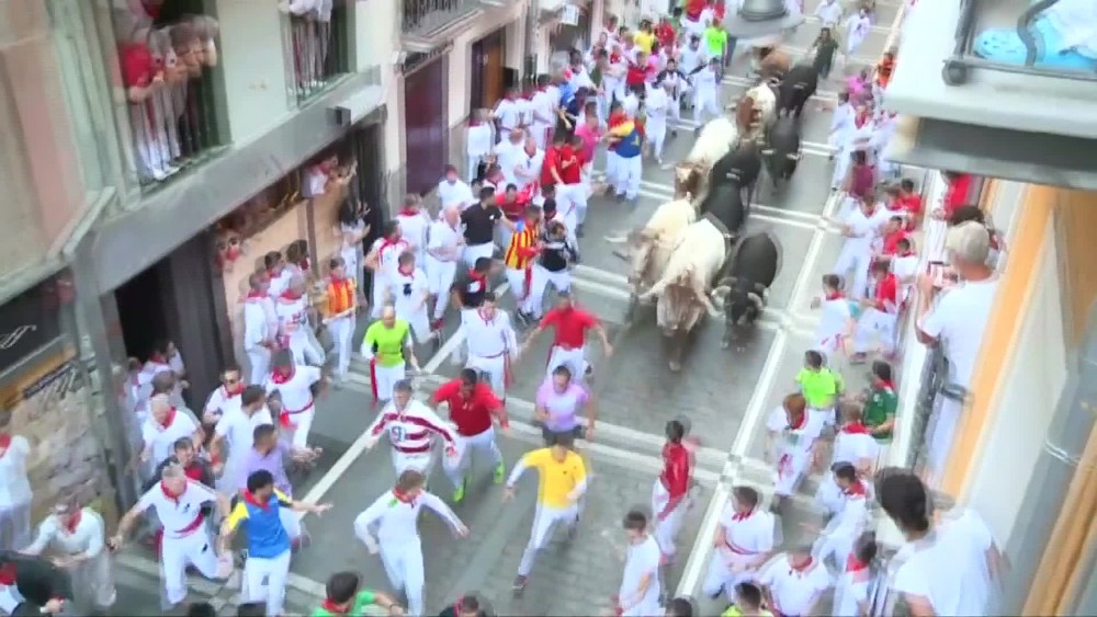 The annual bull run in Pamplona, Spain has given breathtaking moments to courageous men and women who choose to run with the animals along narrow streets. The runners crowded into the almost 800 meter course that leads to the town's bull ring. Participants warmed up before 10 bulls were released to run along the route.
